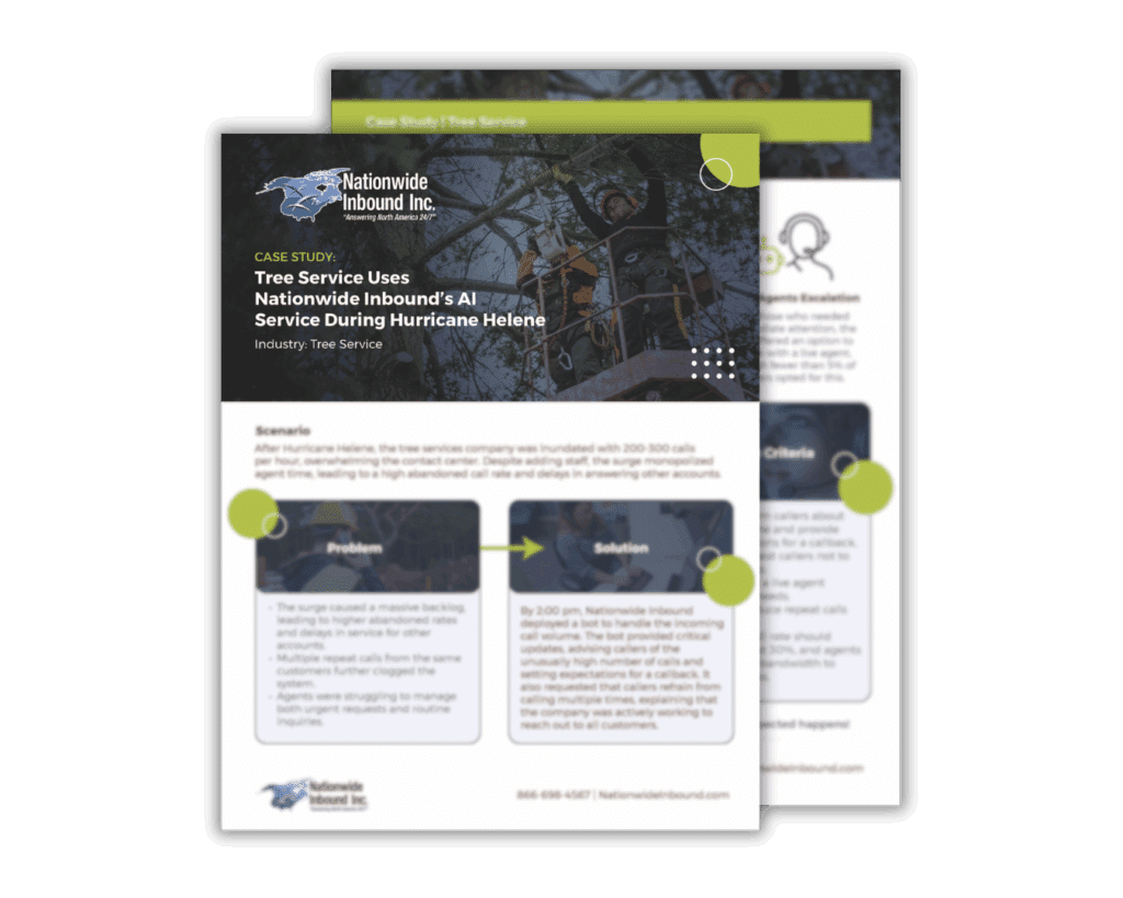 In your world, every call matters. Missing just one could mean losing a loyal customer or a major opportunity. Nationwide Inbound’s AI-powered call solutions ensure you never miss a beat. Whether it’s an emergency flood of calls, a weekend rush, or after-hours chaos, our AI is always on!